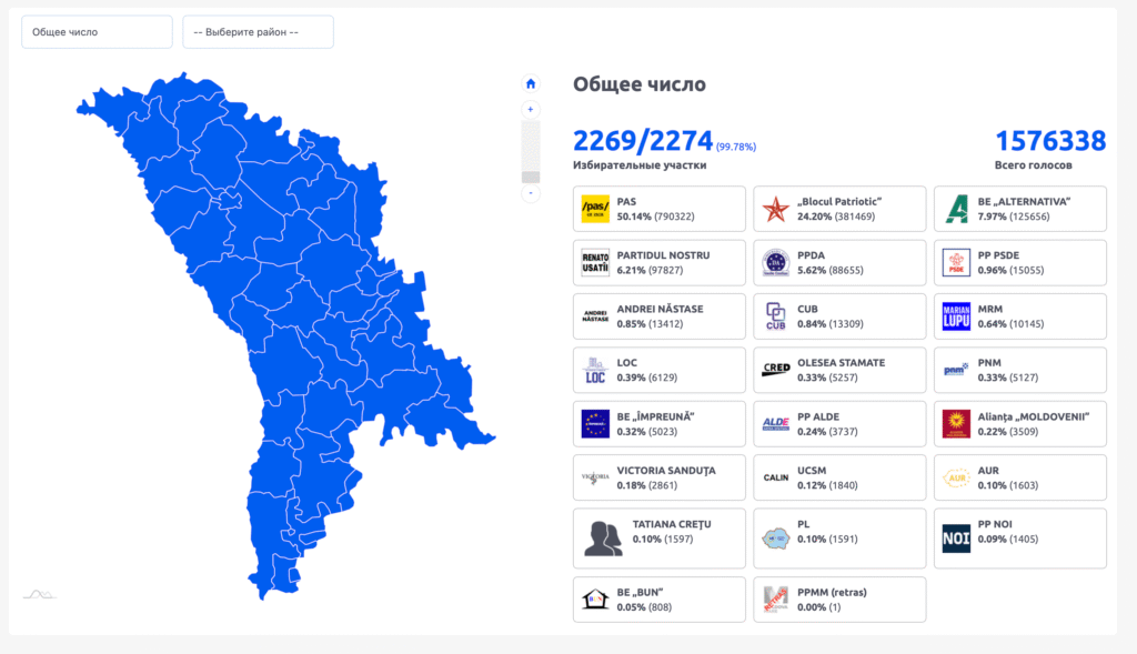 Итоговая карта по результатам голосования: партия PAS одержала победу во всех регионах страны, набрав 50,14% голосов. Источник: ЦИК Молдовы