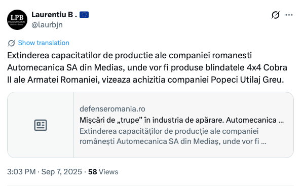 4. «Turkish Otokar to take over Romanian military vehicles producer Automecanica for EUR 85 mln» — Romania Insider • Румыния • 29 января 2026 | Ссылка ➚