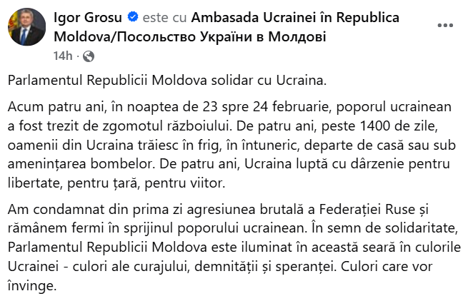 - Facebook: Igor Grosu, 24 февраля 2026 — ссылка